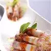 3.用煮好的肉片包裹黄瓜丝、胡萝卜丝和葱段做成卷摆盘。生抽、辣椒油、白糖和香油调成汁。