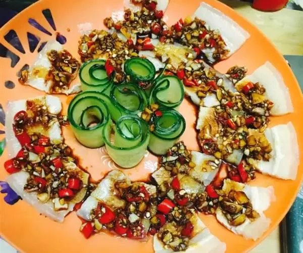 酱汁:盐(1/3汤匙)、酱油(1汤匙)、白糖(1/3汤匙)、浓缩鸡汁(1汤匙)、辣椒油(2汤匙)、香油(1/2汤 匙)、葱花(1汤匙)、肉汤(1杯)