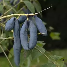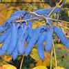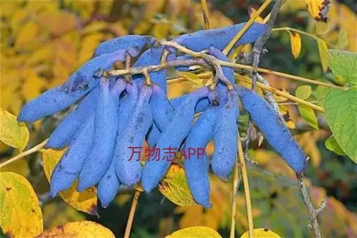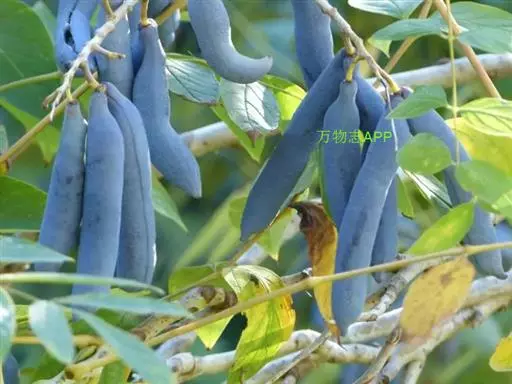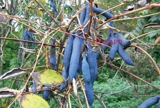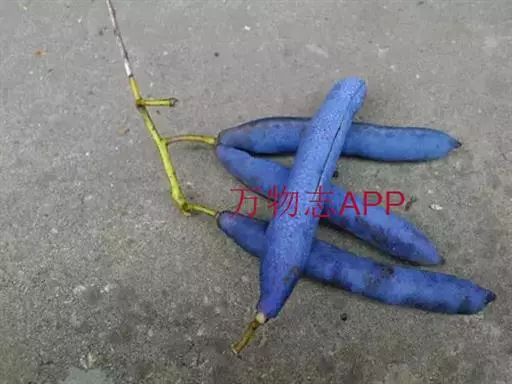 果下垂,圆柱形,蓝色,长5-10厘米,直径约2厘米,顶端截平但腹缝先端延伸为圆锥形凸头,具小疣凸,果皮表面有环状缢纹或无;种子倒卵形,黑色,扁平,长约1厘米。花期4-6月,果期7-8月。