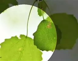 症状特点:杨树锈病是侵害杨树幼树和苗木的主要病害之一,主要为害叶片,也为害叶柄、嫩梢和冬芽。初期被害叶片上出现橙黄色粉状斑点,黄粉(夏孢子)日益增多,成为再侵染的病原中心。夏孢子借风传播,再侵染新叶。5、6月间最为严重,叶片病斑相连成片,常造成焦叶、落叶。冬芽受害后不能展叶或绉缩加厚,向叶背卷缩。叶柄、嫩梢被害形成条状病斑。雨季发病较轻,8~9月又进入第二次发病盛期。苗圃地易感此病。