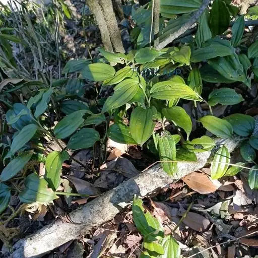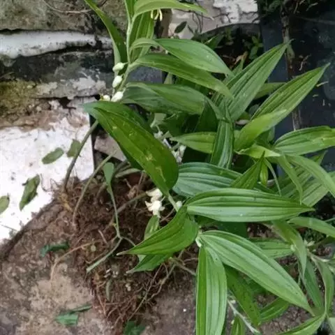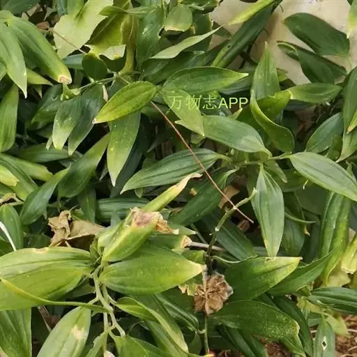 竹根七又名:假万寿竹。根状茎连珠状,粗1-1.5厘米。茎高25-50厘米。叶纸质,卵形、椭圆形或矩圆状披针形,长4-9(-15)厘米,宽2.3-4.5厘米,先端渐尖,基部钝、宽楔形或稍心形,具柄,两面无毛。花1-2朵生于叶腋,白色,内带紫色,稍俯垂;花梗长7-14毫米;花被钟形,长15-22毫米;花被筒长约为花被的2/5,口部不缢缩,裂片近矩圆形;副花冠裂片膜质,与花被裂片互生,卵状披针形,长约5毫米,先端通常2-3齿或二浅裂;花药长约2毫米,背部以极短花丝着生于副花冠两个裂片之间的凹缺处;雌蕊长8-9毫米;花柱与子房近等长。浆果近球形,直径7-14毫米,具2-8颗种子。花期4-5月,果期11月。