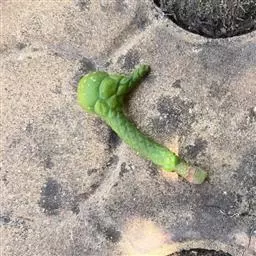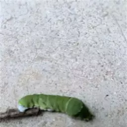 幼虫,即俗称的菜青虫。幼虫共5龄,末龄幼虫体长28~35毫米。幼虫初孵化时灰黄色,后变青绿色,体圆筒形,中段较肥大,背部有一条不明显的断续黄色纵线,气门线黄色,每节的线上有两个黄斑。体密布细小黑色毛瘤,各体节有4~5条横皱纹 。