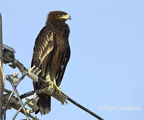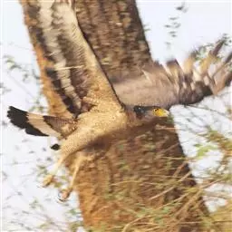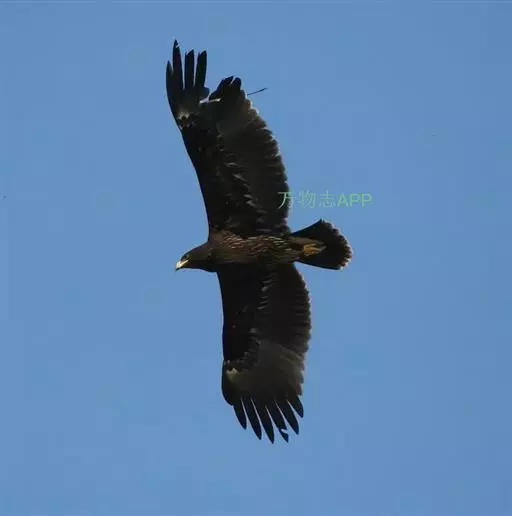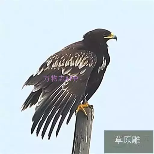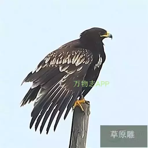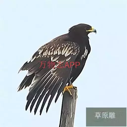 乌雕体形体长61~74厘米,体重1.310~2.100千克,为中大型猛禽。 乌雕 乌雕通体为暗褐色,背部略微缀有紫色光泽,颏部、喉部和胸部为黑褐色,其余下体稍淡。尾羽短而圆,基部有一个“V”字形白斑和白色的端斑,与草原雕不同。飞行时两翅宽长而平直,两翅不上举。虹膜为褐色,嘴黑色,基部较浅淡;蜡膜和趾为黄色,爪为黑褐色;鼻孔为圆形,而其他雕类的鼻孔均为椭圆形;尾短,蜡膜及脚为黄色。体羽随年龄及不同亚种而有变化。幼鸟翼上及背部具有明显的白色点斑及横纹。所有型的羽衣其尾上覆羽均具白色的“U”形斑,飞行时从上方可见。尾比金雕雕或白雕肩雕为短。