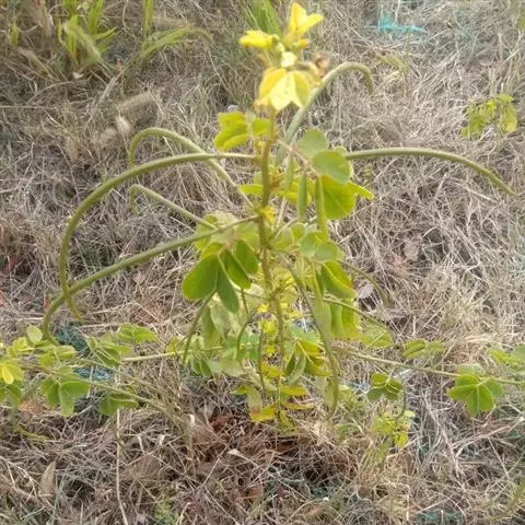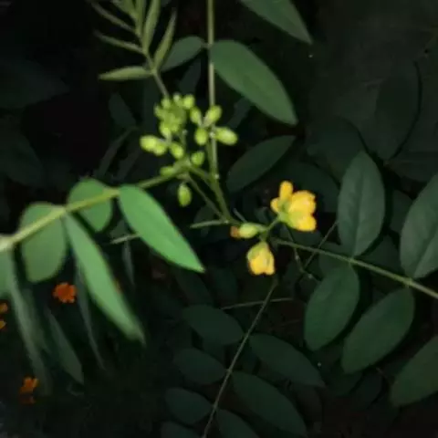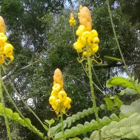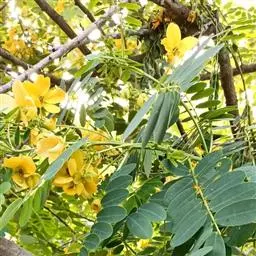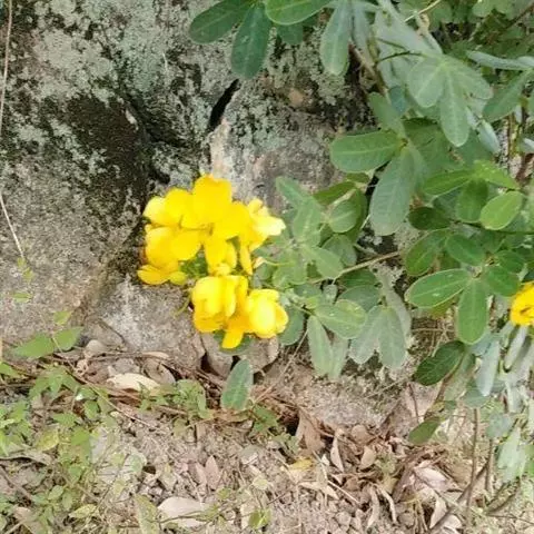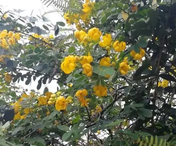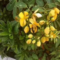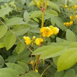 黄槐 灌木或小乔木,高5-7米;分枝多,小枝有肋条;树皮颇光滑,灰褐色;嫩枝、叶轴、叶柄被微柔毛。