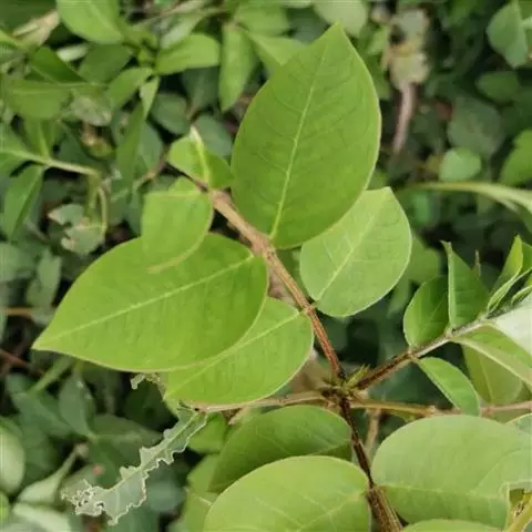 叶长10-15厘米;叶轴及叶柄呈扁四方形,在叶轴上面最下2或3对小叶之间和叶柄上部有棍棒状腺体2-3枚;小叶7-9对,长椭圆形或卵形,长2-5厘米,宽1-1.5厘米,下面粉白色,被疏散、紧贴的长柔毛,边全缘;小叶柄长1-1.5毫米,被柔毛;托叶线形,弯曲,长约1厘米,早落。
