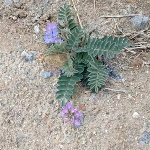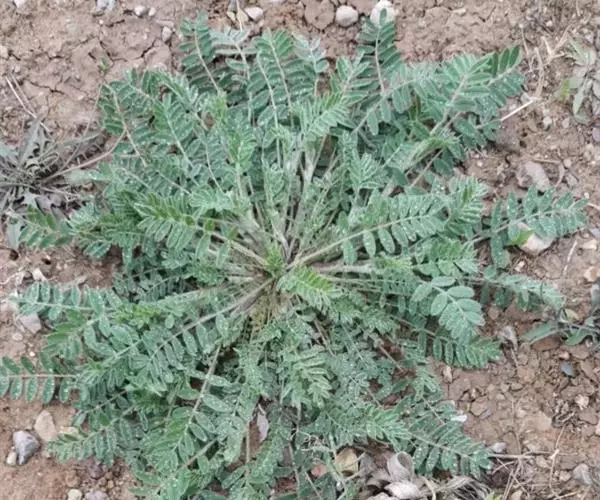 多年生草本,主根圆锥状。分茎极缩短,叶及总花梗于分茎上丛生。托叶宿存,下面的阔三角形,上面的狭三角形,基部合生,外面密被白色长柔毛;叶在早春时长仅2-5厘米,夏秋间可长达15厘米,个别甚至可达23厘米,早生叶被长柔毛,后生叶毛稀疏,甚几至无毛;叶柄具沟;小叶7-21片,椭圆形到长圆形,卵形到长卵形,有时披针形,顶端小叶有时为倒卵形,长 (4.5) 10-14 (-25) 毫米,宽 (1.5) 5-8 (-10) 毫米,基部圆,先端具细尖,急尖、钝、微缺或下凹成弧形。伞形花序有2-6朵花;总花梗具沟,被长柔毛,花期较叶稍长,花后约与叶等长或短于叶长;苞片三角状线形,长2-4毫米,花梗长1-3.5毫米;花萼钟状,长7-8毫米,被贴伏长柔毛,上2萼齿最大,与萼筒等长,下3萼齿较小,最下一片最小;花冠紫堇色,旗瓣长13毫米,宽8毫米,倒卵形,全缘,先端微缺,基部渐狭成瓣柄,翼瓣长10毫米,宽3毫米,斜长倒卵形,具短耳,瓣柄长3毫米,龙骨瓣长6毫米,宽2毫米,倒卵形,瓣柄长2.5毫米;子房椭圆状,密被贴服长柔毛,花柱无毛,内卷,顶端膨大成圆形柱头。荚果圆筒状,长17-22毫米,直径3-4毫米,被长柔毛;种子三角状肾形,直径约1.8毫米,具凹点。花期4月。果期5-6月。