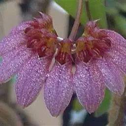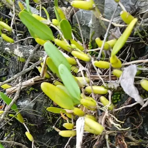 密花石豆兰(学名:Bulbophyllum odoratissimum (J. E. Smith) Lindl.):根状茎粗2-4毫米,分枝,被筒状膜质鞘,在每相距4-8厘米处生1个假鳞茎。根成束,分枝,出自生有假鳞茎的节上。假鳞茎近圆柱形,直立,顶生1枚叶,幼时在基部被3-4枚鞘。叶革质,长圆形,近无柄。花葶淡黄绿色,从假鳞茎基部发出,1-2个,直立;总状花序缩短呈伞状,常点垂,密生10余朵花;花稍有香气,初时萼片和花瓣白色,以后萼片和花瓣的中部以上转变为橘黄色;花瓣质地较薄,白色,近卵形或椭圆形,长1-2毫米,中部宽1-1.5毫米,先端稍钝,具1条脉,有时3条,但仅中肋到达先端;唇瓣橘红色,肉质,舌形,稍向外下弯。花期4-8月。
