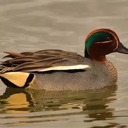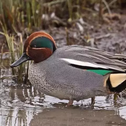 绿翅鸭是小型鸭类,体长37厘米,体重约0.5千克。嘴脚均为黑色。雄鸟头至颈部深栗色,…