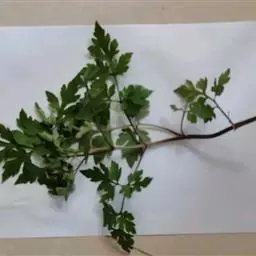 叶为一回羽状复叶,顶生小叶卵形至长圆状卵形或卵状披针形,长2-7厘米,宽1-2.5厘米,先端渐尖,基部楔形,边缘具稍密且近于均匀的锯齿,有时一侧深裂为一小裂片,两面均被柔毛,侧生小叶1-2对,卵形或卵状长圆形,近顶部的一对稍小,通常不分裂,基部下延,无柄或具短柄,下部的一对约与顶生小叶相等,具明显的柄,三出复叶状分裂或仅一侧具一裂片,裂片椭圆形,边缘有锯齿;总叶柄长1.5-5厘米,无毛或被疏柔毛。