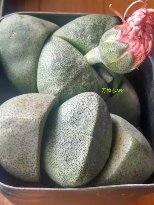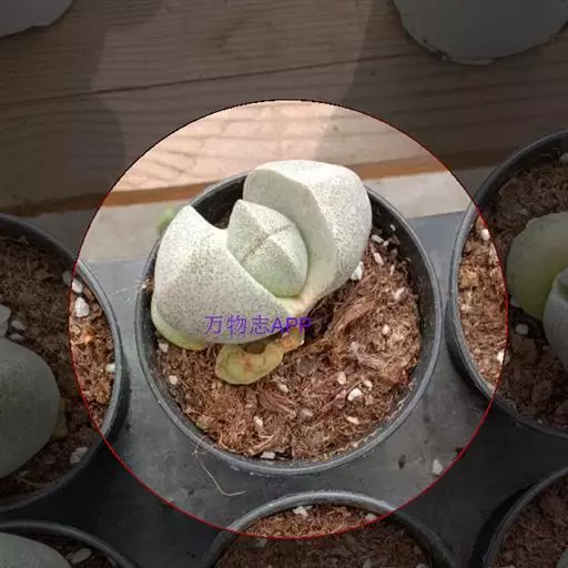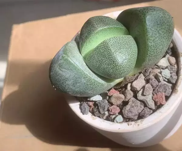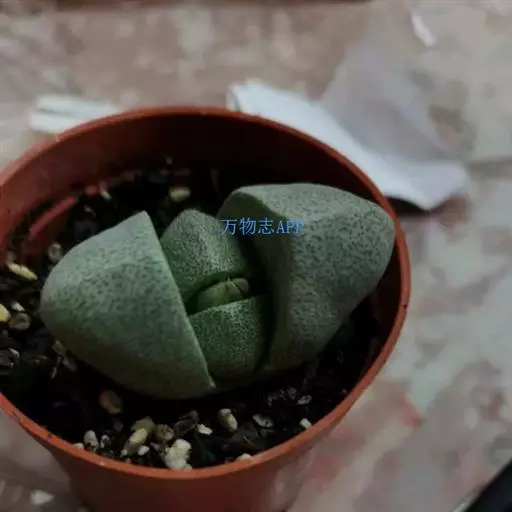 番杏科对叶花属多肉植物。原产南非开普省。非常肉质的卵形叶交互对生,基部联合,整个株形像元宝。叶外缘钝圆,表面较平,背面凸起,灰绿色有许多透明的小斑点。新叶长出后老叶慢慢皱缩,但有时一对老叶中叠生两对小叶形成三对叶共存的现象。