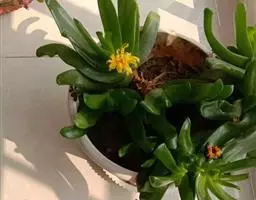 帝玉 为多肉植物,植株无茎,非常肉质的卵形叶交互对生,其基部联合,整个株形像元宝。叶外缘钝圆,表面较平,背面凸起,灰绿色,有许多透明的小斑点,叶表面平展,背面凸起,新叶长出后下部老叶皱缩枯干,因 此植株始终保持着1对至3对对生叶。花具短梗,直径7厘米,花朵橙黄色,花心颜色稍浅,花期春季。