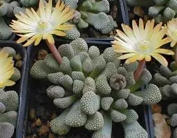 荒玉为番杏科生石花属,原产南非。株体呈白粉色,表面布满凹凸纹路,凹陷处为红褐色,每年秋季开黄花。