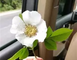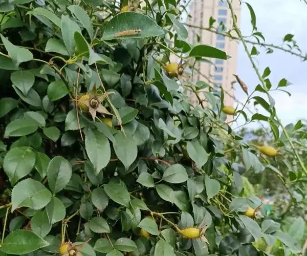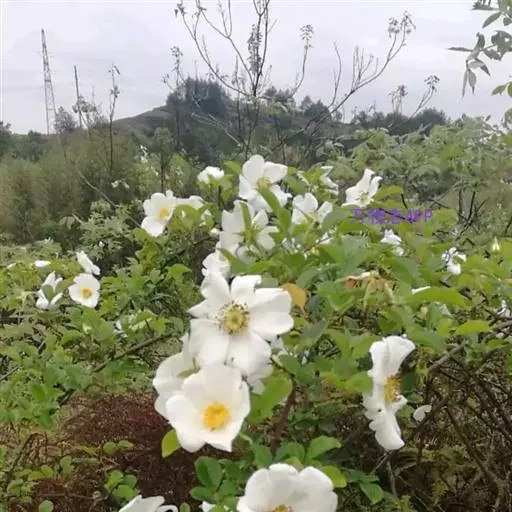 金樱子(学名:Rosa laevigata Michx.):常绿攀援灌木,高可达5米;小枝粗壮,散生扁弯皮刺,无毛。小叶革质,通常3,稀5;小叶片椭圆状卵形、倒卵形或披针状卵形,边缘有锐锯齿,上面亮绿色,无毛,下面黄绿色;托叶离生或基部与叶柄合生,披针形,边缘有细齿。花单生于叶腋,直径5-7厘米;花瓣白色,宽倒卵形,先端微凹;果梨形、倒卵形,稀近球形,紫褐色,外面密被刺毛。花期4-6月,果期7-11月。