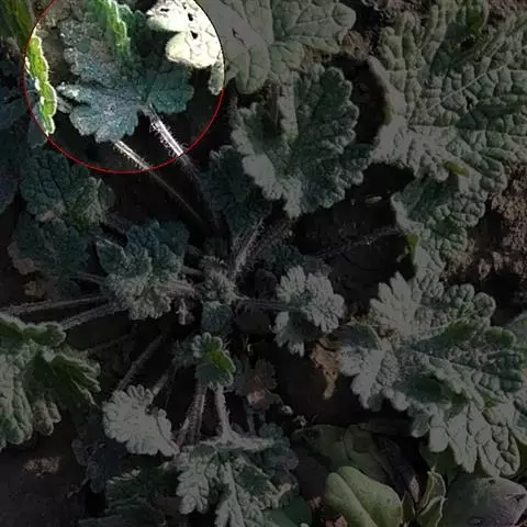 基出叶多数,卵圆形或近戟形,长7-16厘米,宽约为长的1/2,基部深心形,基片圆形或近锐尖,先端锐尖,边缘具规则的圆齿,干时绿色或淡褐色,上面略具皱,疏布贴生的短毛,下面尤其是在脉上较密被疏柔毛及密被红色腺点;叶柄长约为叶片二倍,被毛同茎。茎生叶圆形,但具较短的叶柄。
