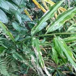姜叶枯病属真菌性病害,主要为害叶片,病叶上初生黄褐色病斑,逐渐向整个叶片扩展,病部生出黑色小粒点,严重时全叶变褐枯死。
