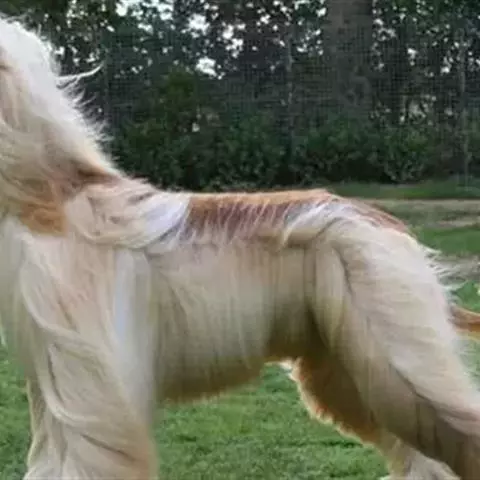 比较长,尖端略细,延伸到离地面1.5英寸的地方,或低于飞节1.5英寸。当他静止时,笔直下垂或略微弯曲,运动时或兴奋时,尾巴卷曲,但不能举过背部。覆盖有大量毛发,毛发浓厚而呈刚毛质地,下半部分毛发略长,而末端略有刘海不属于缺陷。卷曲或环状尾巴属于缺陷