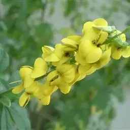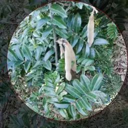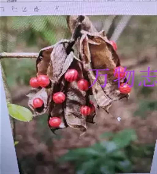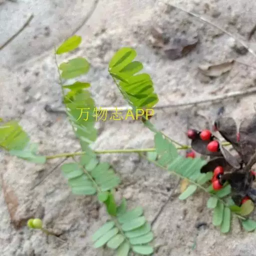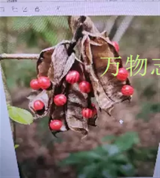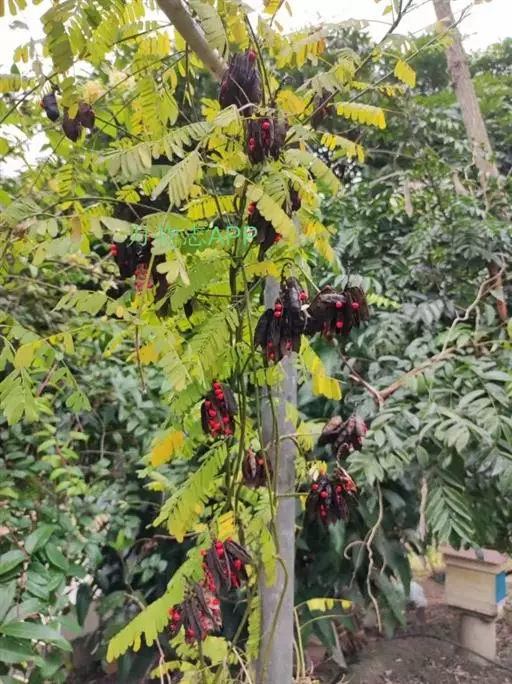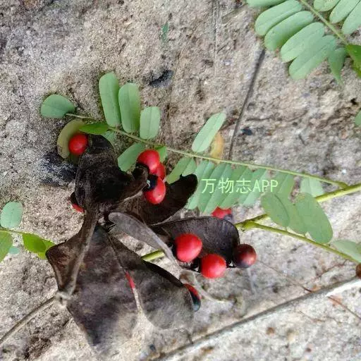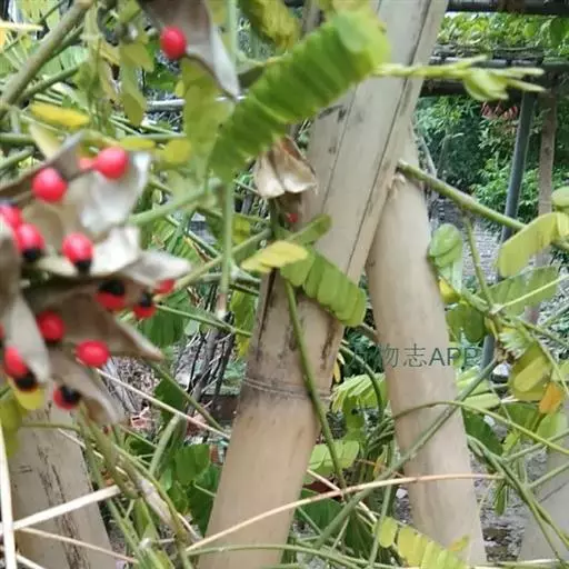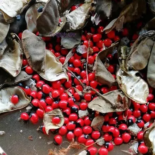 荚果长圆形,果瓣革质,长2-3.5厘米,宽0.5-1.5厘米,成熟时开裂,有种子2-6粒;种子椭圆形,平滑具光泽,上部约三分之二为鲜红色,下部三分之一为黑色。花期3-6月,果期9-10月。
