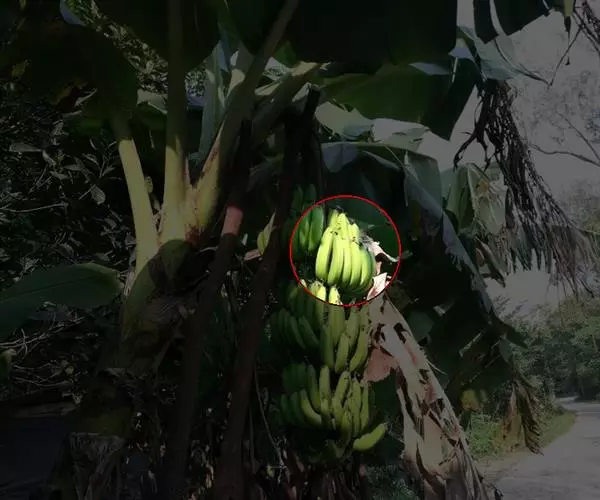 穗状花序下垂,花序轴无毛,苞片卵形或卵状披针形,长15-30厘米以上,脱落,外面呈紫红色,内面深红色,每苞片有花二列,雄花脱落。花被片黄白色,合生花被片长4-6.5厘米,离生花被片长约为合生花被片长之半,为透明蜡质,具光泽,长圆形或近圆形,先端具小突尖、锥尖或卷曲成一囊。果序由7-8段至数十段的果束组成。果长圆形,按长宽比例较短粗,果身直或微弯曲,长10-20厘米,棱角明显,果柄通常伸长,果肉细腻,紧实,未成熟前味涩,成熟时味甜或略带酸味,但缺香气或微具香气,无种子或具少数种子。剑头芽假茎红色,带有极多白粉而呈浅黄绿色。