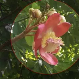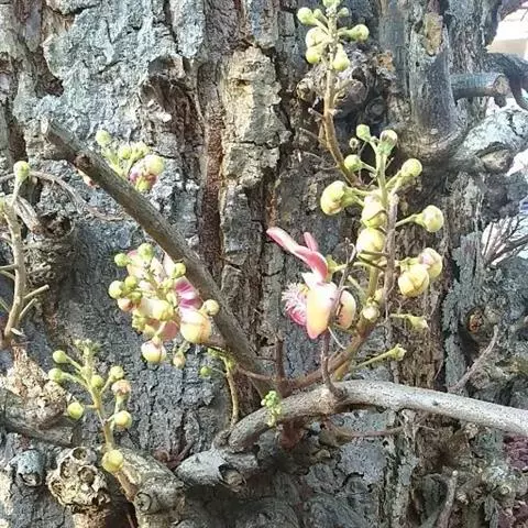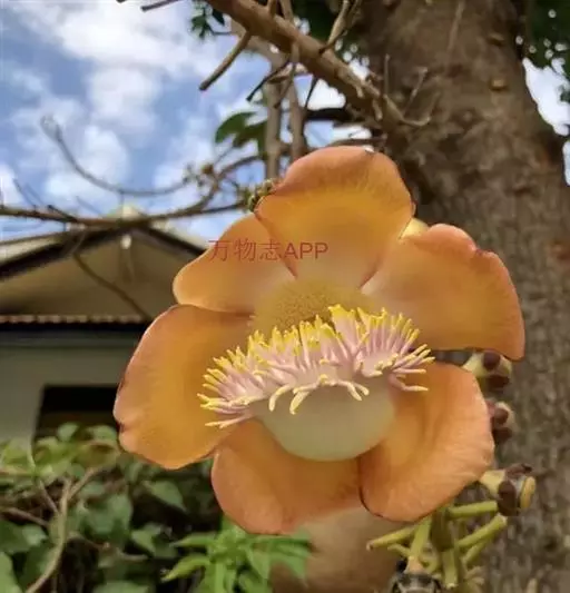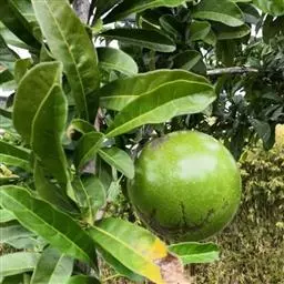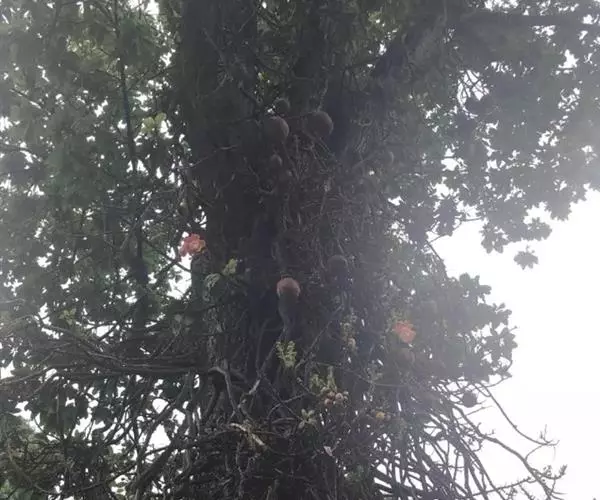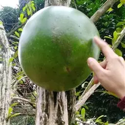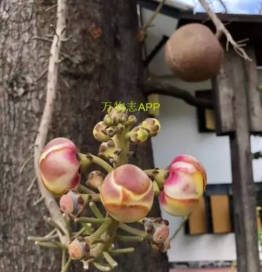 铁西瓜(学名Crescentia cujete L.)为紫葳科、葫芦树属的常绿小乔木,高5~18米,为典型的热带雨林“老茎生花”植物。其花、果单生于小枝或老茎上;花冠钟形,淡绿黄色,具褐色脉纹,春夏开花。