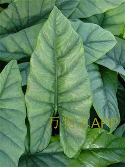 通常1-2年生的只有1叶,3-4年生的有3-4叶。叶与花序同时抽出。叶柄圆柱形,长约60厘米,密生紫色斑点,中部以下具膜质叶鞘;叶片幼时内卷如角状(因名),后即展开,箭形,长15-45厘米,宽9-25厘米,先端渐尖,基部箭状,后裂片叉开成 70度的锐角,钝;中肋背面隆起,I级侧脉7-8对,最下部的两条基部重叠,集合脉与边缘相距5-6毫米,