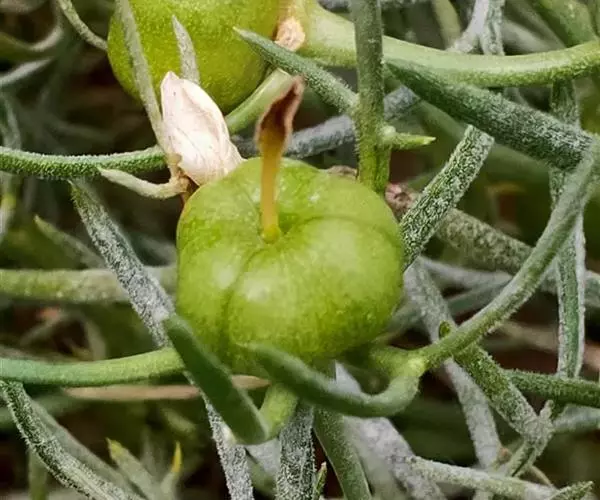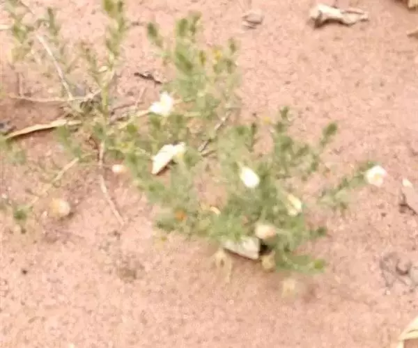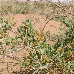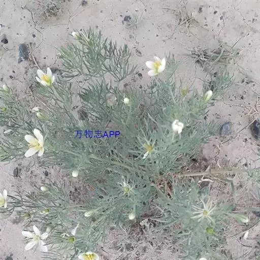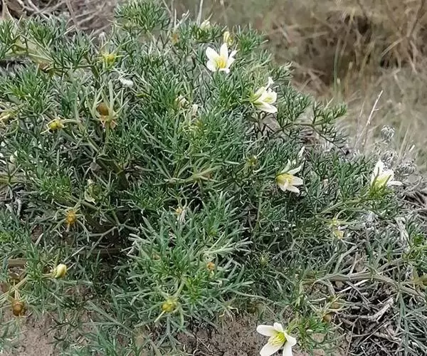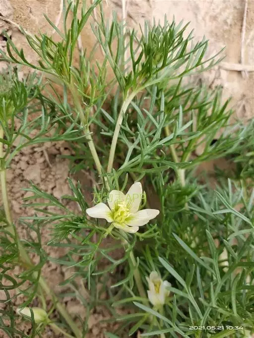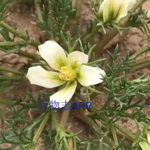 植物-骆驼蓬(图1) 多年生草本,高30-70厘米,无毛。根多数,粗达2厘米。茎直立或开展,由基部多分枝。叶互生,卵形,全裂为3-5条形或披针状条形裂片,裂片长1-3.5厘米,宽1.5-3毫米。花单生枝端,与叶对生;萼片5,裂片条形,长1.5-2厘米,有时仅顶端分裂;花瓣黄白色,倒卵状矩圆形,长1.5-2厘米,宽6-9毫米;雄蕊15,花丝近基部宽展;子房3室,花柱3。蒴果近球形,种子三棱形,稍弯,黑褐色、表面被小瘤状突起。骆驼蓬5月上旬返青,7~8月开花,9~10月种子成熟。