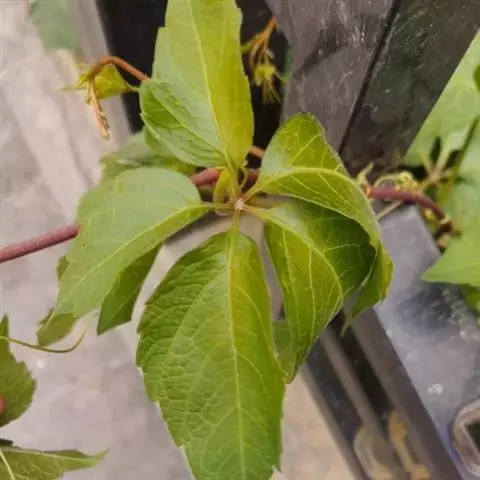 叶为掌状5小叶,小叶倒卵长椭圆形或倒卵披针形,长2-12厘米,宽1-5厘米,最宽处在近中部或中部以上,顶端急尖或渐尖,基部楔形,边缘上半部有5-12个锯齿,上面深绿色,无毛,显著呈泡状隆起,下面浅绿色,在脉上被短柔毛;侧脉4-9对,网脉上面不明显,下面微突起;叶柄长2-6厘米,被短柔毛,小叶有短柄或几无柄。