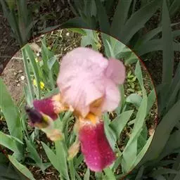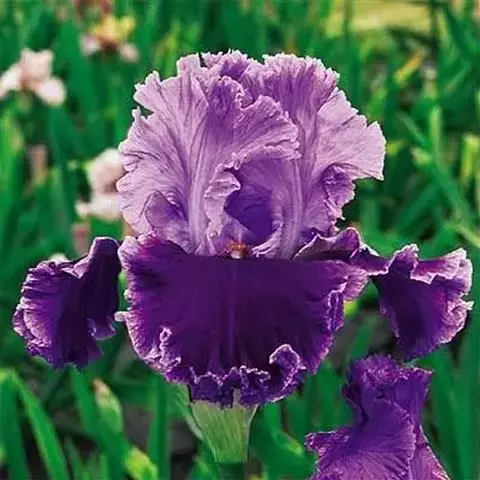花茎实心,高40-60厘米,上部二歧状分枝,分枝处生有披针形的茎生叶,下部有1-2枚抱茎的茎生叶,花序生于分枝顶端;苞片4-5枚,膜质,绿色,边缘白色,披针形,长1.5-2.3厘米,内包含有3-4朵花;花蓝紫色或浅蓝色,有棕褐色的斑纹,直径4-4.5厘米;花梗细,常超出苞片,长2-3.5厘米;花被管甚短,外花被裂片宽倒披针形,长3-3.5厘米,宽约1厘米,上部向外反折,无附属物,内花被裂片狭倒卵形,长约2.5厘米,宽6-8毫米,顶端微凹;雄蕊长1.6-1.8厘米,花药与花丝等长;花柱分枝扁平,花瓣状,长约2.5厘米,顶端裂片狭三角形,子房绿色,长约1厘米。