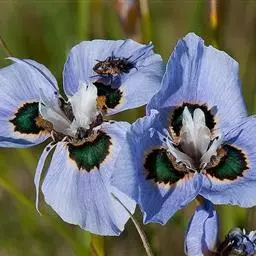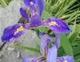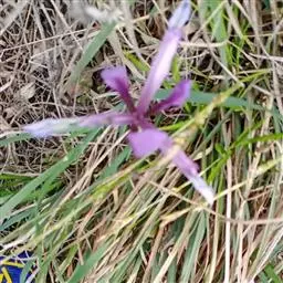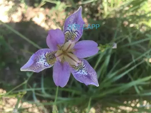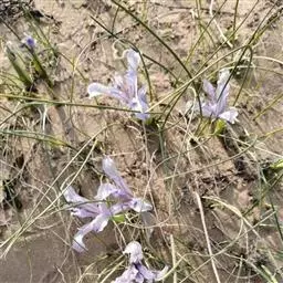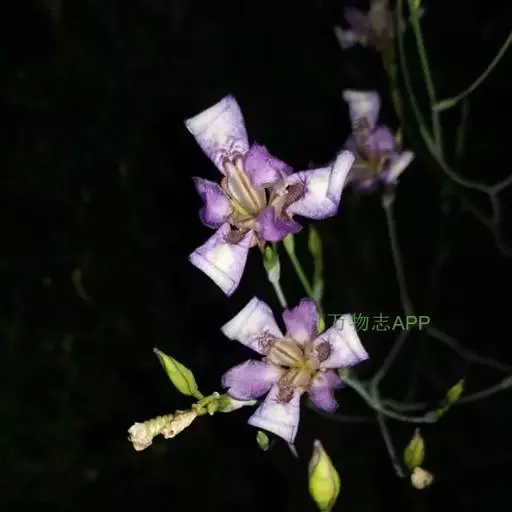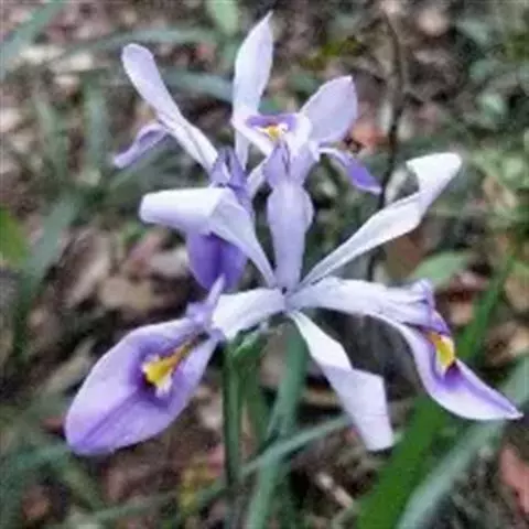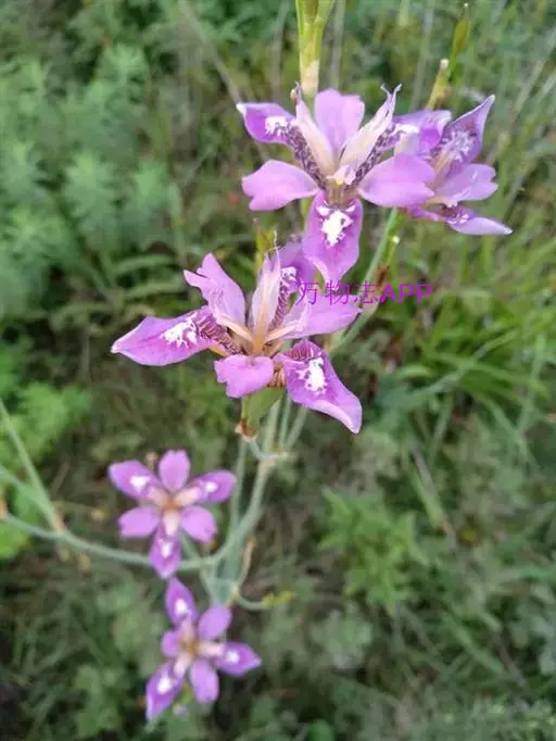 野鸢尾(学名:Iris dichotoma Pall.):多年生草本。根状茎为不规则的块状,棕褐色或黑褐色;须根发达,粗而长,黄白色,分枝少。叶基生或在花茎基部互生,两面灰绿色,剑形。花茎实心,高40-60厘米,上部二歧状分枝,分枝处生有披针形的茎生叶,下部有1-2枚抱茎的茎生叶,花序生于分枝顶端;苞片4-5枚,膜质,绿色,边缘白色,披针形,内包含有3-4朵花;花蓝紫色或浅蓝色,有棕褐色的斑纹,外花被裂片宽倒披针形,上部向外反折,内花被裂片狭倒卵形,顶端微凹。蒴果圆柱形或略弯曲,果皮黄绿色,革质;种子暗褐色,椭圆形,有小翅。花期7-8月,果期8-9月。