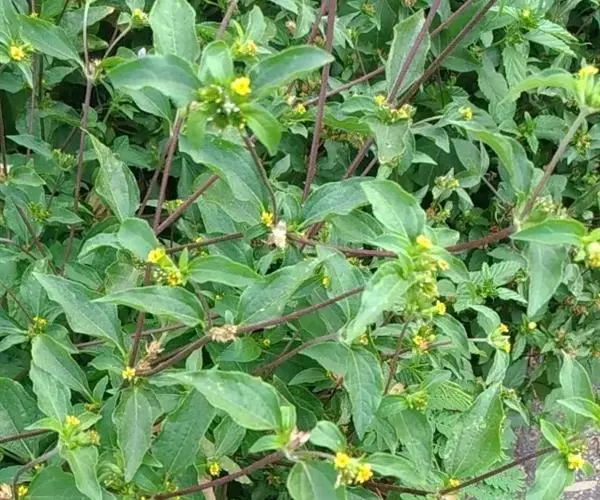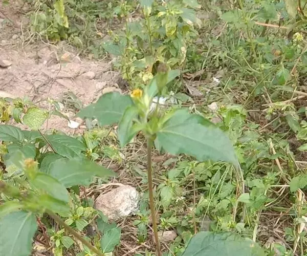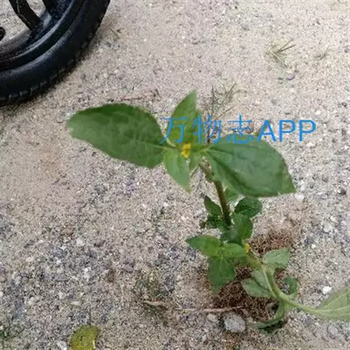 一年生草本。茎直立,高0.5-1米,基部径约5毫米,二歧分枝,被贴生的粗毛或后脱毛,节间长6-22厘米,通常长约10厘米。下部和上部叶具柄,阔卵形至卵状披针形,连叶柄长7-12厘米,宽3.5-6.5厘米,基部下延成2-5毫米宽的翅状宽柄,顶端短渐尖或有时钝,两面被贴生、基部为疣状的糙毛,在下面的毛较密,近基三出主脉,在上面明显,在下面稍凸起,有时两侧的1对基部外向分枝而似5主脉,中脉中上部常有1-4对细弱的侧脉,网脉明显或仅在下面一明显。头状花序径4-5毫米,长约10毫米,无或有短花序梗,常2-6簇生于叶腋,或在顶端成扁球状,稀单生;小花黄色;总苞卵形或长圆形;苞片数个,外层总苞片绿色,叶状,卵状长圆形或披针形,长10-20毫米,背面被贴生的糙毛,顶端钝或稍尖,基部有时渐狭,内层总苞片干膜质,鳞片状,长圆形至线形,长4-8毫米,背面被疏糙毛或无毛。托片线形,长6-8毫米,宽0.5-1毫米。舌状花连管部长约10毫米,舌片椭圆形,顶端2浅裂;管状花向上渐扩大,长约10毫米,檐部4浅裂,裂片卵状或三角状渐尖。雌花瘦果倒卵状长圆形,扁平,深黑色,长约5毫米,宽约2.5毫米,边缘有增厚、污白色宽翅,翅缘各有6-8个长硬尖刺;冠毛2,挺直,刚刺状,长约2毫米,向基部粗厚,顶端锐尖;两性花瘦果倒锥形或倒卵状圆柱形,长4-5毫米,宽约1毫米,黑色,有纵棱,腹面压扁,两面有疣状突起,腹面突起粗密;冠毛2-5,叉开,刚刺状,等长或不等长,基部略粗肿,顶端锐尖。花期6-10月。