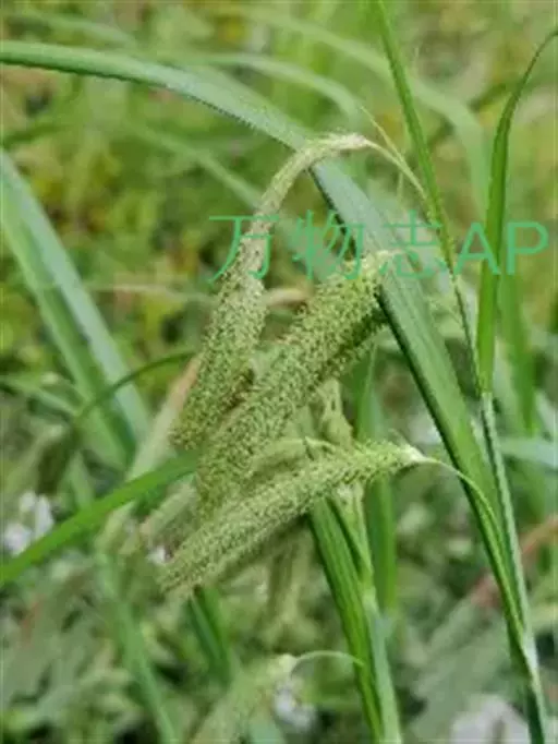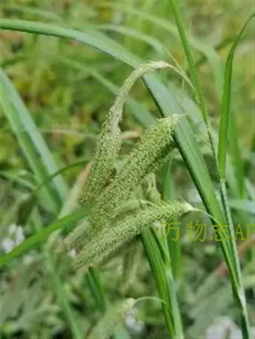 苞片下部的2枚叶状,长于花序,上部的刚毛状。小穗5-6个,接近,顶端1个雌雄顺序,长4-5厘米;侧生小穗雌性,上部3个其基部具雄花,圆柱形,长4.5-5.5厘米,宽5-6毫米;小穗柄纤细,长1.5-6厘米,向上渐短,下垂。雌花鳞片倒卵状长圆形,顶端微凹或截平,具粗糙长芒(芒长约2.2毫米),长4-4.5毫米,中间3脉淡绿色,两侧白色膜质,疏生锈色点线。