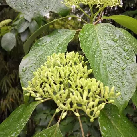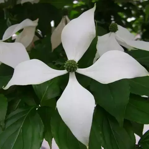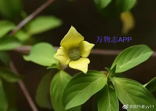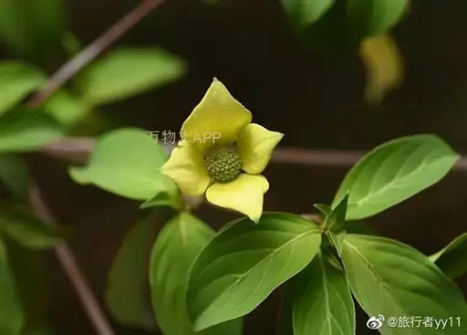 头状花序球形,约为100余朵绿色花聚集而成,直径1.2厘米;总苞片4,白色,倒卵形或阔倒卵形,稀近于圆形,长3.5-6.2厘米,宽1.5-5厘米,先端突尖,基部狭窄,两面微被贴生短柔毛;花萼管状,长约1.2毫米,先端4裂,裂片齿形,外侧密被白色细毛及少数褐色毛,内侧有白色短柔毛;花瓣4,长圆形,长3-4毫米,下面被有白色贴生短柔毛;雄蕊4,花丝纤细,长约3毫米,花药椭圆形,长近0.8毫米;花盘环状,略有4浅裂;子房下位,花柱圆柱形,长1.5毫米,密被白色丝状毛。