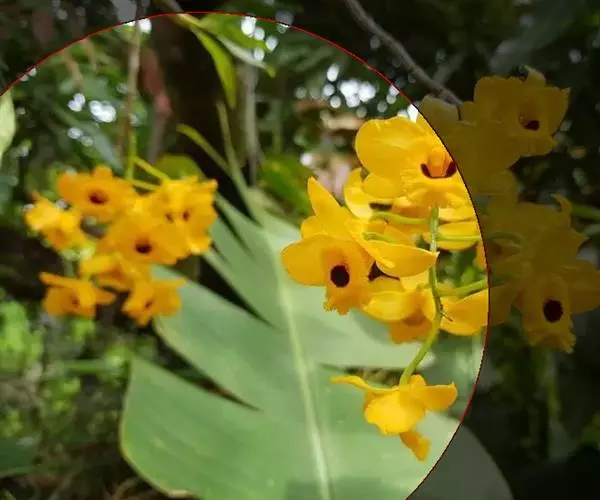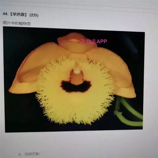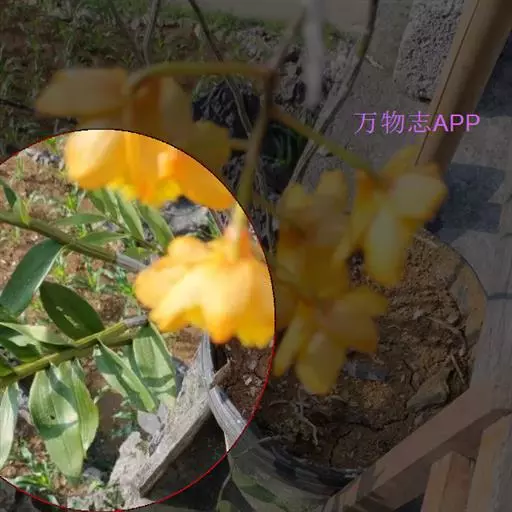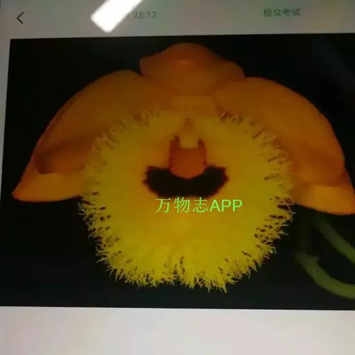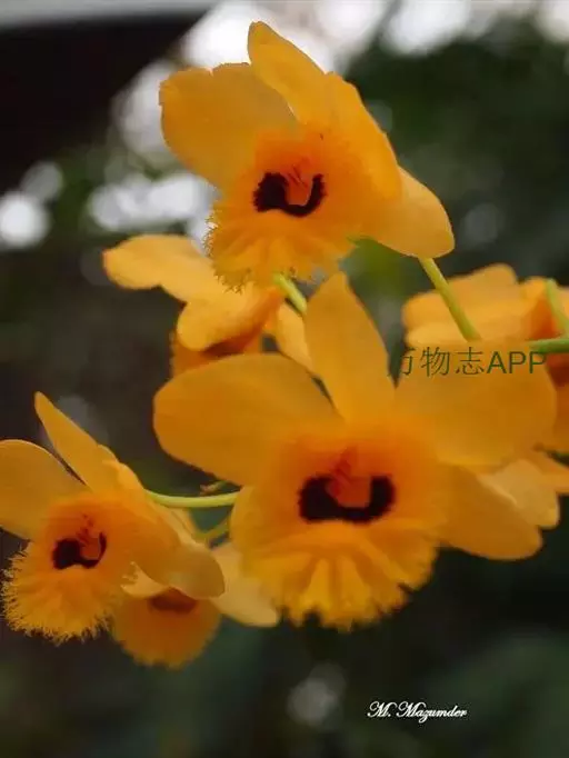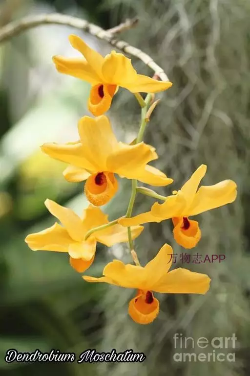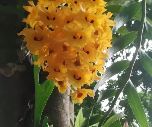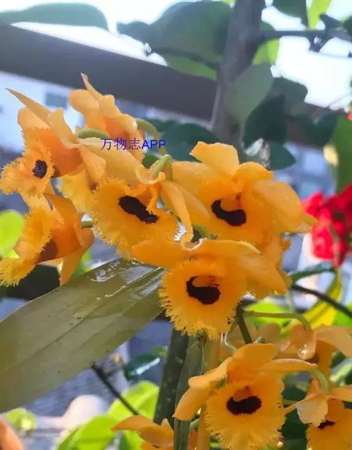 流苏石斛(学名:Dendrobium fimbriatum Hook.):茎粗壮,斜立或下垂,质地硬,圆柱形或有时基部上方稍呈纺锤形,不分枝,具多数节。叶二列,革质,长圆形或长圆状披针形。总状花序长5-15厘米,疏生6-12朵花;花金黄色,质地薄,开展,稍具香气;花瓣长圆状椭圆形,长1.2-1.9厘米,宽7-10毫米,先端钝,边缘微啮蚀状,具5条脉;唇瓣比萼片和花瓣的颜色深,近圆形,长15-20毫米,基部两侧具紫红色条纹并且收狭为长约3毫米的爪,边缘具复流苏。花期4-6月。