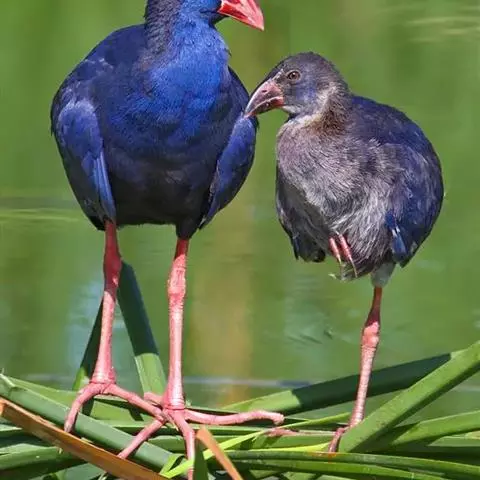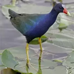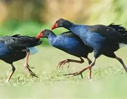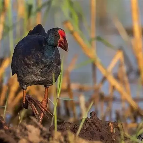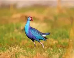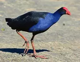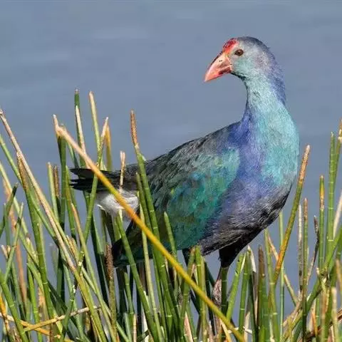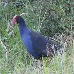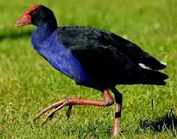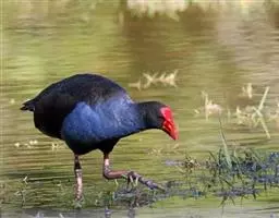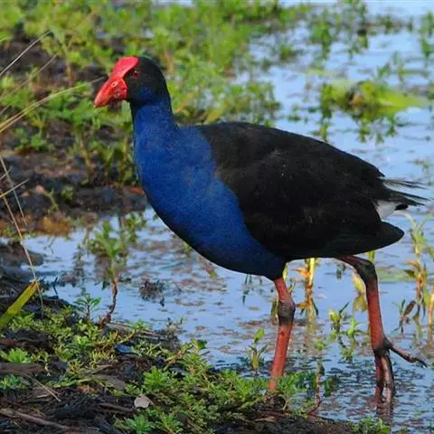 紫水鸡 紫水鸡,体大(42厘米)而壮,紫蓝色,红色的嘴特形大,除尾下覆羽为白色外,整个体羽蓝黑色并具紫色及绿色闪光。具一红色的额甲。 虹膜红色;嘴红色;脚红色。咕咕咯咯叫个不停;另有带鼻音的号角声wak。分布于古北界至非洲、东亚地区、澳大利亚及大洋洲。亚种poliocephalus为云南西南部的罕见繁殖鸟,可能在西藏极东南部也有分布。云南西部、广西及香港有迷鸟越冬记录。栖于多芦苇的沼泽地及湖泊,在水上漂浮植物及芦苇地中行走。有时结小群到漫水的开阔草地、稻田或火烧过后的草地上活动。尾上下抽动。