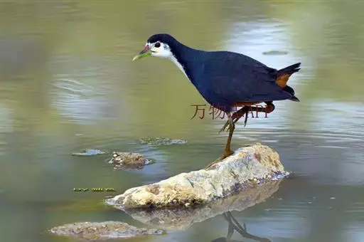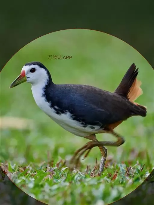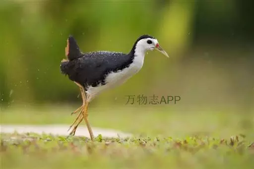 黑水鸡 黑水鸡,中等体型(31厘米),黑白色,额甲亮红,嘴短。体羽全青黑色,仅两胁有白色细纹而成的线条以及尾下有两块白斑,尾上翘时此白斑尽显。 虹膜红色;嘴暗绿色,嘴基红色;脚绿色。响而粗的嘎嘎作叫pruruk-pruuk-pruuk。除澳大利亚及大洋洲外,几乎遍及全世界。冬季北方鸟南迁越冬。亚种indica繁殖于新疆西部,包括天山;指名亚种繁殖于华东、华南、西南、海南岛、台湾及西藏东南部的中国大部地区。越冬在北纬32°以南。多见于湖泊、池塘及运河。栖水性强,常在水中慢慢游动,边在水面浮游植物间翻拣找食。也取食于开阔草地。于陆地或水中尾不停上翘。不善飞,起飞前先在水上助跑很长一段距离。
