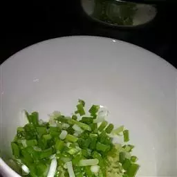 4、蒜苗洗净切段。锅中放油,放花椒面炒香。