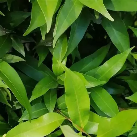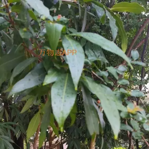 乔木,高10米,主干极短,广分枝;小枝圆形。叶片革质,披针形或长圆形,长12-25厘米,宽3-4.5厘米,先端长渐尖,基部阔楔形,叶面多透明细小腺点,侧脉12-16对,以45度开角斜向上,靠近边缘2毫米处相结合成边脉,侧脉间相隔7-10毫米,在下面明显突起,网脉明显;叶柄长6-8毫米。