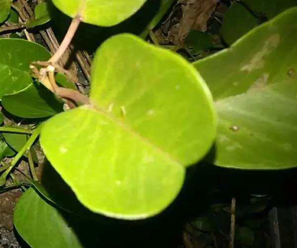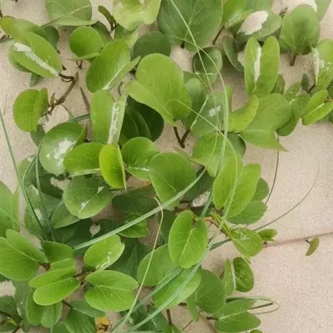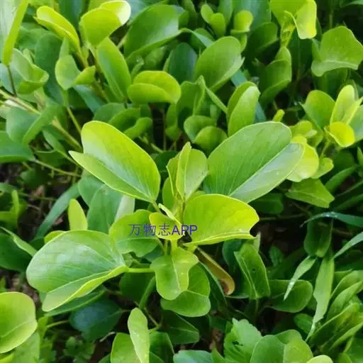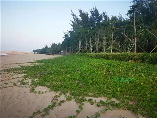 厚藤为多年生草本,全株光滑;茎极长而匍匐地面;叶互生,厚革质,形如马鞍。