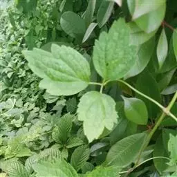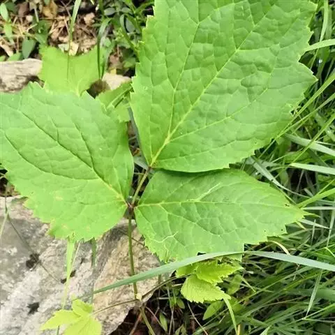 三出复叶,数叶与花簇生,或对生;小叶片为长椭圆状卵形、卵形或披针状卵形,边缘疏生粗大钝锯齿;长2-7厘米,宽1-5厘米,边缘缺刻状锯齿由多而锐至粗而钝,顶端3裂或不明显,两面疏生短柔毛,有时下面较密。
