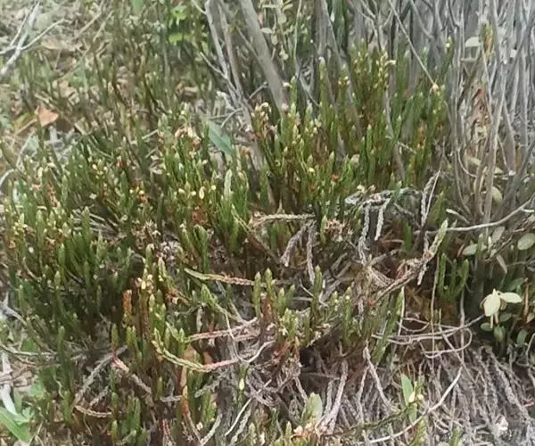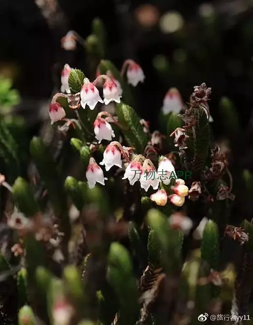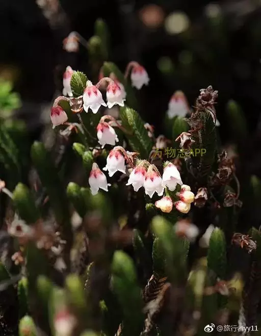 常绿矮小半灌木,高5-25厘米;枝条多而密,外倾上升或铺散成垫状,小枝长5-7厘米,直径2-2.4毫米,无毛,密生交互对生的叶。叶硬革质,披针形至披针状长圆形,长2-3毫米,宽(0.7-)1-1.7毫米,基部稍宽,2裂叉开,顶端稍钝,幼时具1长达0.75毫米的紫红色芒刺,背面龙骨状隆起,有1深纵沟槽,向上几达叶顶端,背面有光泽,无毛,腹面近凹陷,被微毛,边缘被纤毛,以后变无毛,留下疏齿状的残余或全缘。花单朵腋生;花梗长1.5-2.2厘米,有时更短,被蛛丝状长柔毛,顶部下弯,花下垂,基部为苞片所包围;花萼5,绿色或紫红色,裂片卵状披针形或披针形,长2.5-3毫米,无毛;花冠乳白色,宽钟状,长7-10毫米,两面无毛,口部5浅裂,裂片宽三角形;雄蕊10枚,较花冠短,花丝长5-7毫米,被柔毛。蒴果球形,直径5-8毫米,无毛,花柱宿存。花期4-5月,果期6-7月。 [1-2]