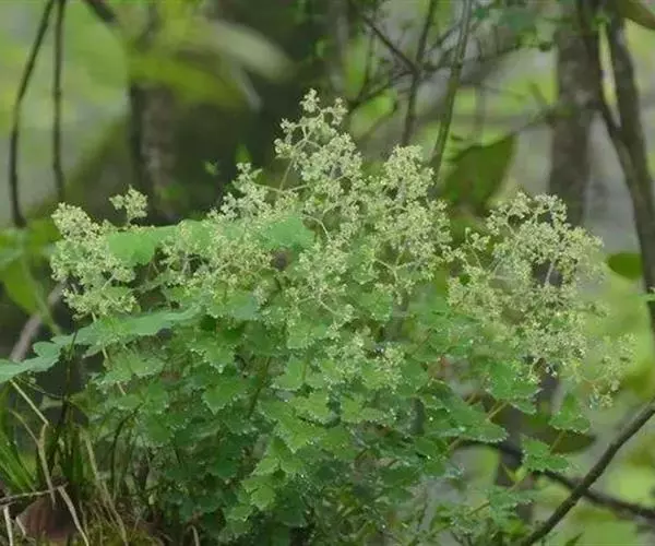 聚伞圆锥花序,长5-15厘米,宽2.5-8厘米,多次三叉分枝;雌雄异株,稀两性花;雄花小,多,萼片4,披针形,长0.5毫米;花瓣4,黄绿色,匙形,长1.5毫米;雄蕊8,较花瓣短;鳞片4,楔状四方形,长0.3毫米;心皮4,小;雌花萼片、花瓣各4,绿色或紫色,线形,长1.2毫米,鳞片4,近半圆形,长0.5毫米;心皮4,卵形,叉开的,长1.5毫米,基部合生。