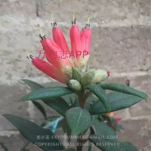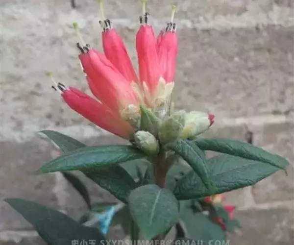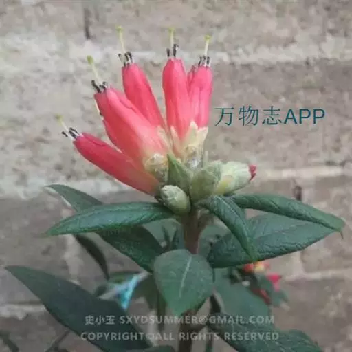 花序伞形,有2-4花;花梗长0.2-1厘米,连同花萼密被灰白色柔毛和鳞片;花萼浅杯状,无裂片;花冠筒状,两端略狭缩,长1.5-2.5厘米,朱红色、鲜红色或橙红色,上部5裂,裂片卵形,直立,花冠外面洁净,稀于裂片中部至筒部条状被短柔毛;雄蕊10,不等长,略伸出花冠之外,花药紫黑色,花丝无毛,稀基部有短柔毛;子房5室,密被茸毛并覆有鳞片,花柱长伸出花冠之外,无毛稀基部被短柔毛。