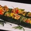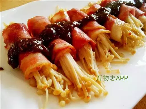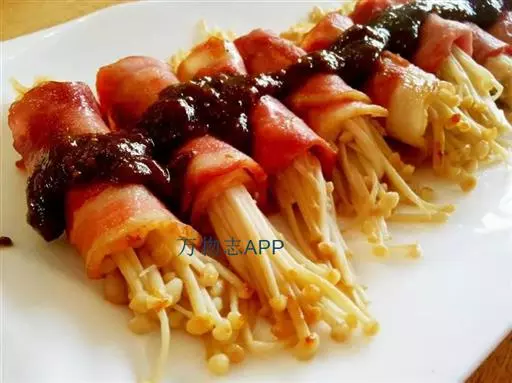 5、每片培根卷鼓鼓的卷进炒好的金针菇,用牙签固定。