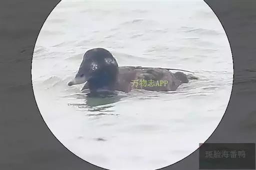 斑脸海番鸭是一种中等体型的深色矮扁型海鸭。雄鸟通体黑色,具紫色光泽,翼镜白色;颏、喉、前颈和下体稍棕,眼下及眼后有白点,嘴灰但端黄且嘴侧带粉色,脚深红色。雌鸟烟褐,眼和嘴之间及耳羽上各有一白色点块斑,羽端棕色,嘴甲和上嘴大都淡紫色,嘴峰、上嘴边缘黑色;脚深红色。飞行时,次级飞羽白色易别于黑海番鸭,脚色浅。虹膜-雄鸟白而雌鸟褐;嘴-雄鸟嘴基有黑色肉瘤,其余为粉红色及黄色,雌鸟近灰色。