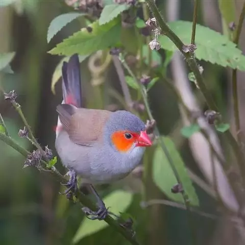 橙颊梅花雀体长约10厘米,头部灰色,两侧有大块橙色区域,嘴基及眼下方有黑纹,两条黑纹间呈白色,…