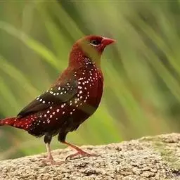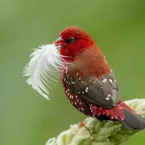 红梅花雀小型鸟类,体长9-10厘米。雄鸟通体朱红色,背、肩、胸等满布白色小斑点,…