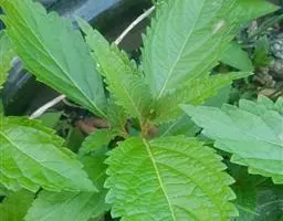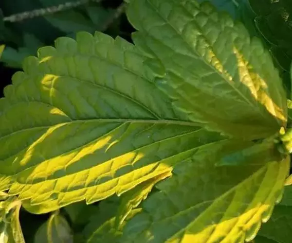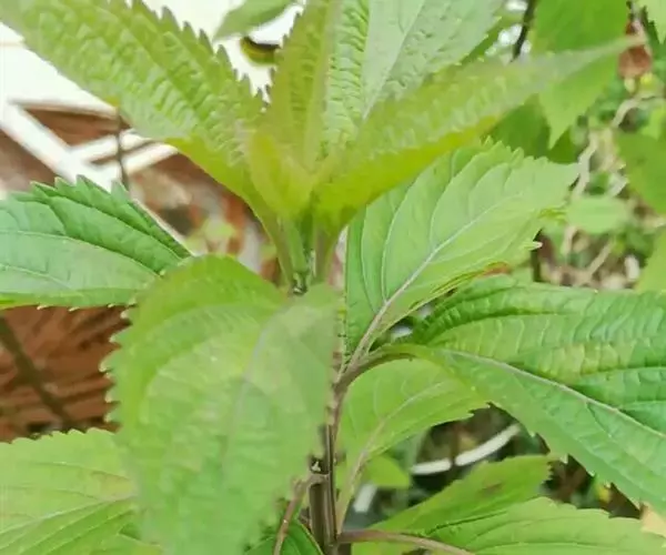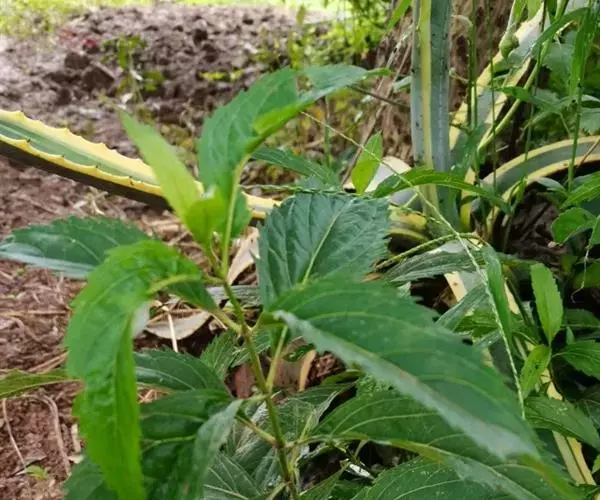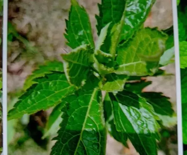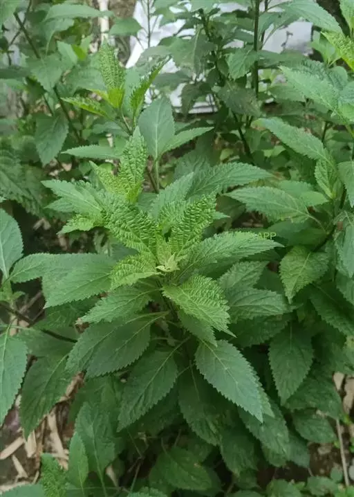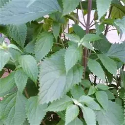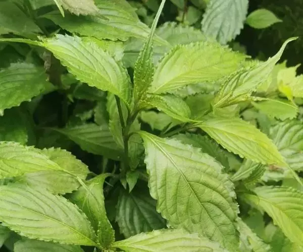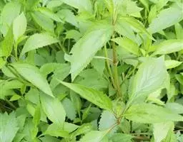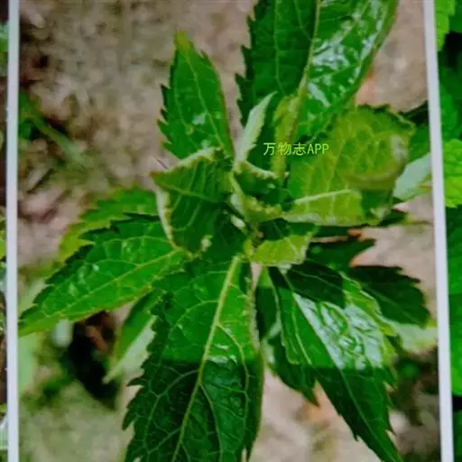 茎叶对生,卵圆形或卵圆状披针形或披针形,长3.5-10厘米,宽1.5-4.5厘米,先端近渐尖,基部楔形,边缘具粗大内弯的锯齿,草质,上面暗绿色,下面淡绿色,两面仅脉.上密被微柔毛,余部无毛,散布淡黄色腺点,侧脉每侧4-55与中脉在两面微隆起,在边缘之内网结,其间平行细脉多少明显;叶柄长0.5-3.5厘米,上部具渐宽大的翅,腹凹背凸,密被微柔毛。