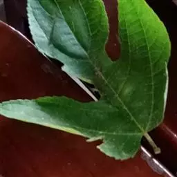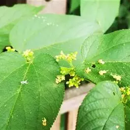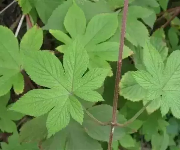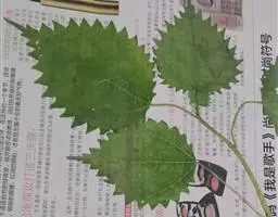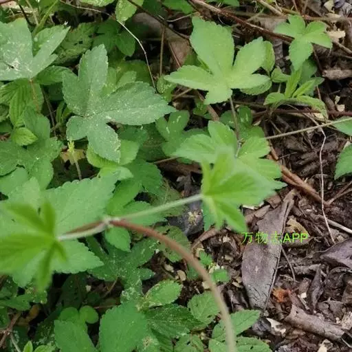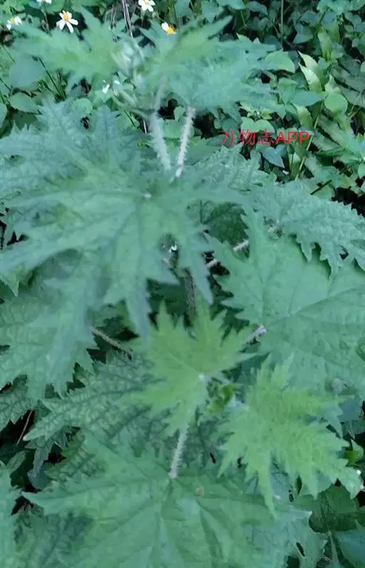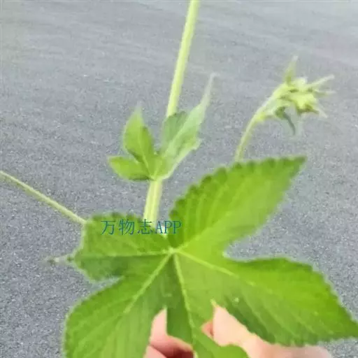 叶纸质,肾状五角形,掌状5-7深裂稀为3裂,长宽约7-10厘米,基部心脏形,表面粗糙,疏生糙伏毛,背面有柔毛和黄色腺体,裂片卵状三角形,边缘具锯齿;叶柄长5-10厘米。雄花小,黄绿色,