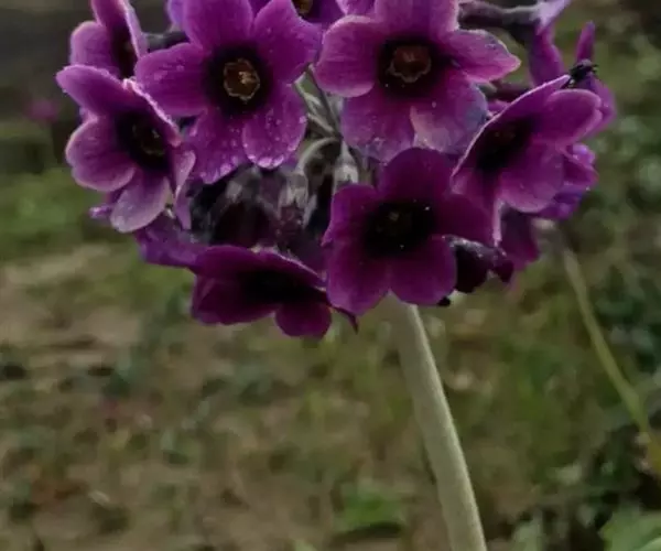 多年生草本,具粗短的根状茎和肉质长根,鲜时有难闻气味。叶丛基部有鳞片包叠;鳞片卵形至卵状披针 形,长可达4厘米,通常被黄粉。叶矩圆形至近匙形或倒披针形,连柄长5-20(30)厘米,宽1-3.5(6)厘米,先端钝圆,有时稍锐尖,基部渐狭窄,边缘具近于整齐的小圆齿,无粉或有时下面被淡黄色粉,中肋宽扁,侧脉稍纤细,两面均明显;叶柄具宽翅,与叶片近等长。花葶高5-30厘米,果时稍伸长,近顶端被粉;伞形花序1轮,(2)4-25花;苞片披针形或狭三角形,长5-10毫米,多少被粉;花梗长5-35毫米,被乳黄色粉或粉质腺体,开花时稍下弯,果时直立,顶端稍增粗;花萼钟状,长5-8毫米,常染紫色,外面被小腺体,分裂近达中部,裂片卵形至卵状矩圆形,先端钝或稍锐尖,内面和外面边缘被乳黄色粉;花冠暗紫色或酱红色,极少白色,冠筒口周围黄色,冠筒长10-14毫米喉部具不明显的环状附属物,冠檐直径1.5-3.5厘米,裂片阔倒卵形至近圆形,先端微凹缺,长花柱花:雄蕊近冠筒中部着生,花柱微伸出筒口;短花柱花:雄蕊着生于冠筒上部,花药顶端露出筒口,花柱约与花萼等长。蒴果球形,短于宿存花萼。花期5-6月,果期7-8月。