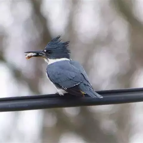 棕腹鱼狗身长38 - 42 cm ,体重305-341 g。主体羽毛蓝色。头顶的冠羽竖起一个小尖峰…