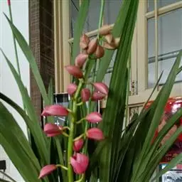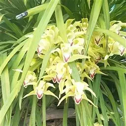 企黑又叫企剑、山川等,株型紧凑;叶片较直立、宽大,叶片墨绿色,无任何斑点或线艺;花香,花茎直立,不高出叶面,每支花的数量一般在8-16朵。